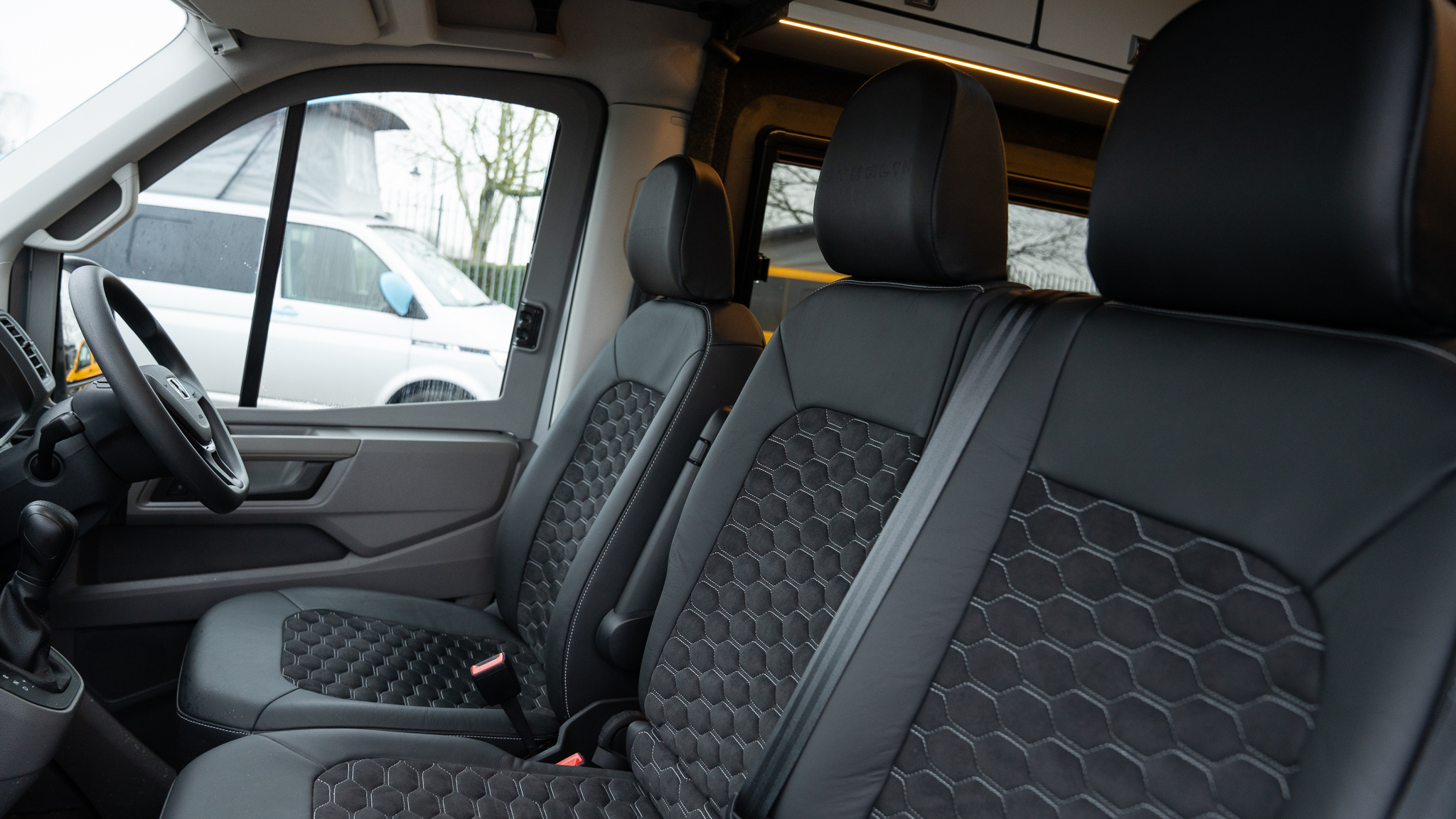 Upholstery:Black honeycomb with white stitching